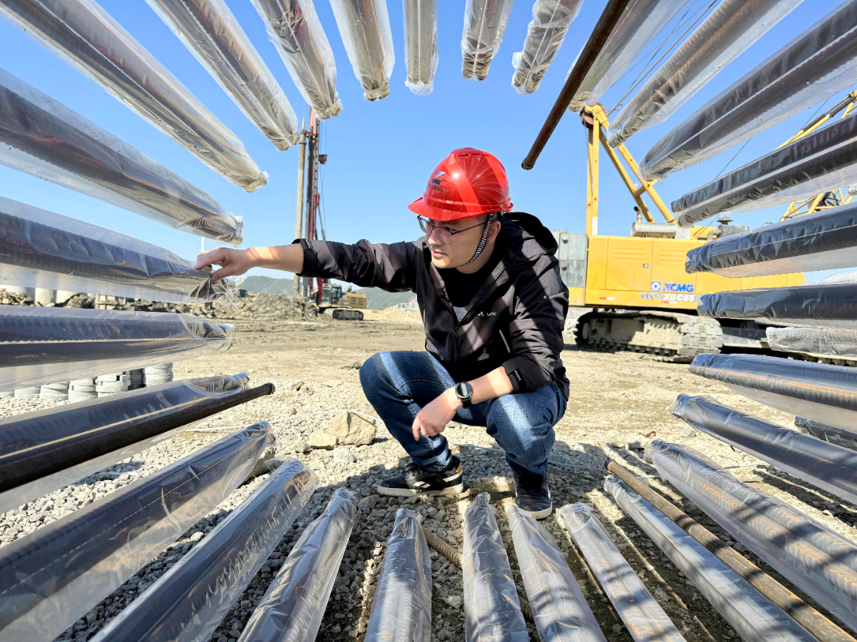 浙江浙能六横液化天然气有限公司员工严捷正在认真检查钢筋笼制作及成品保护。 周志南 摄
