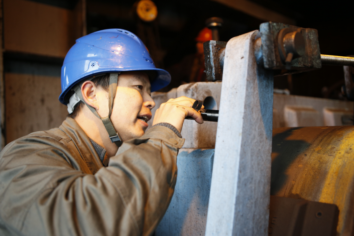 最考验的还是寒冬酷暑时节。夏季烈日高悬,但工作连体服、安全帽、劳保鞋、手套等安全防护措施一个也不能少,在煤尘较大的空间要戴上防护口罩,各种防护装备变成了一个“小锅炉”,对薛俊江进行着高温“烤”验。冬季天寒地冻,几十米高的大机上狂风呼啸,这时防护装备又成了唯一的屏障,他只能低着头,眯着眼睛,一边抵抗着寒风的凌虐,一边加紧进行维修工作。