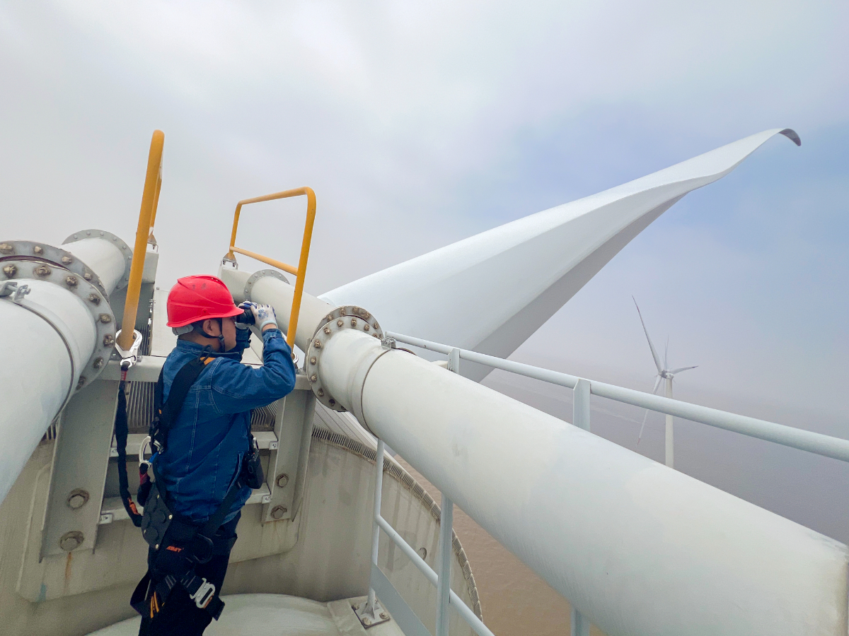 浙能海上风电维护人员对风机叶片进行定期检查。 张露 提供