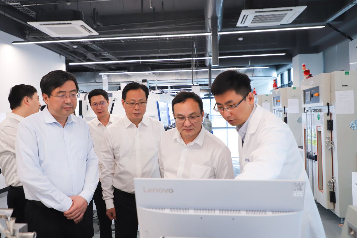 在白马湖实验室展厅,詹敏一行详细了解了实验室空间规划布局建设、核心技术研发攻关及科技成果转化孵化等情况。随后,他实地参观了固态电池等实验室,并与科研人员面对面交流。