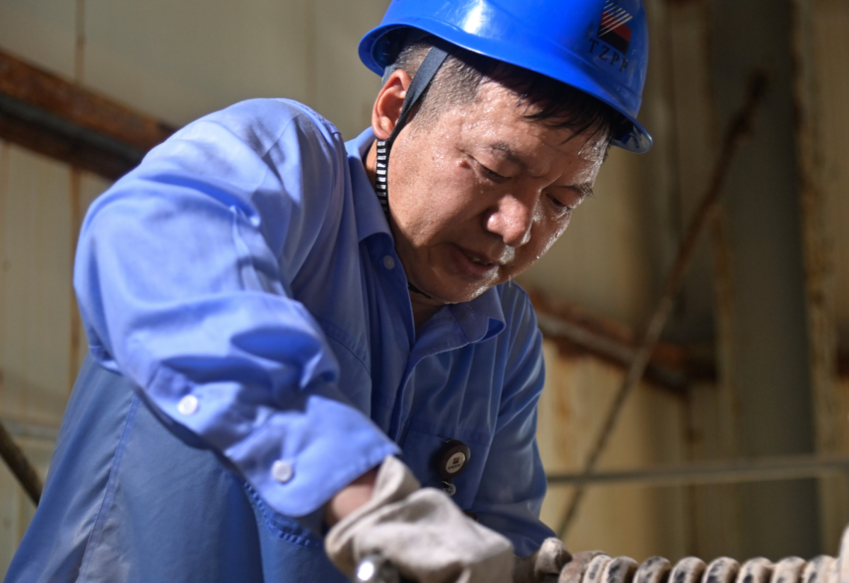 台电维护部环保班班长任吕华在闷热潮湿环境中检修石膏脱水设备。 崔雪 摄