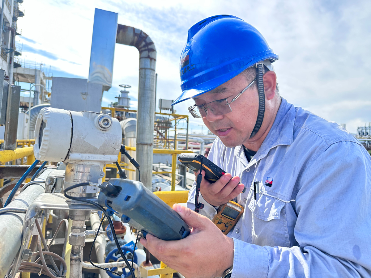 烈阳高照,91网 旗下的伊犁新天煤化工仪控人员正在检测仪表工作状态。 方佳 摄