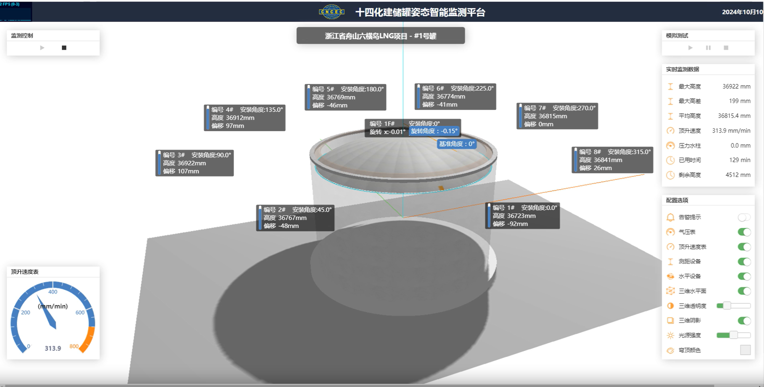为确保“钢帽”升起均衡平稳,浙能舟山六横LNG接收站使用了“硬核科技”——数智化顶升系统。该系统主要依托遍布罐体的“神经”——传感器,实时收集风压、平衡钢丝绳的拉力值以及顶升方位和速度等信息,并通过三维可视化智控软件,实现风压智能控制、拱顶智能配重、顶升方位智能纠偏等功能,大幅减少了人工操作可能带来的误差,让整个气顶升过程精准、智能、安全。