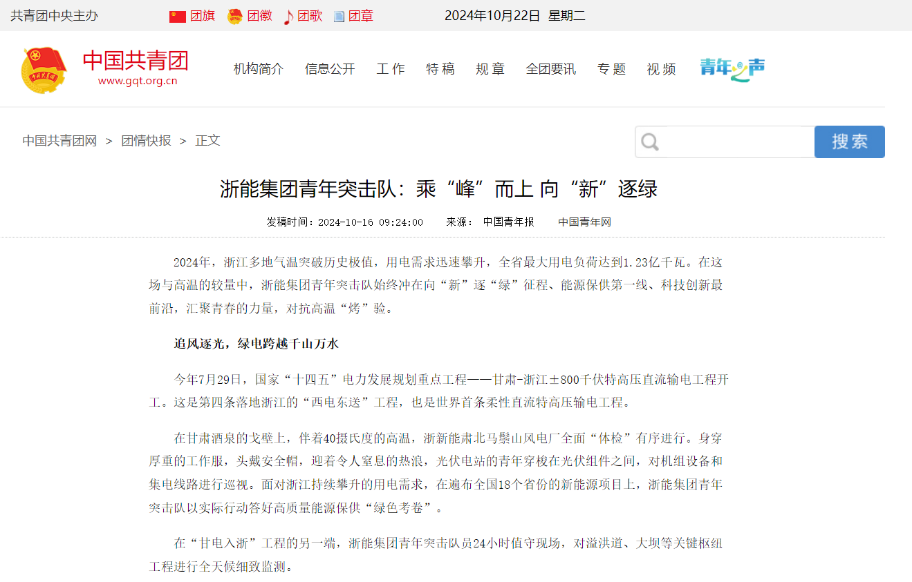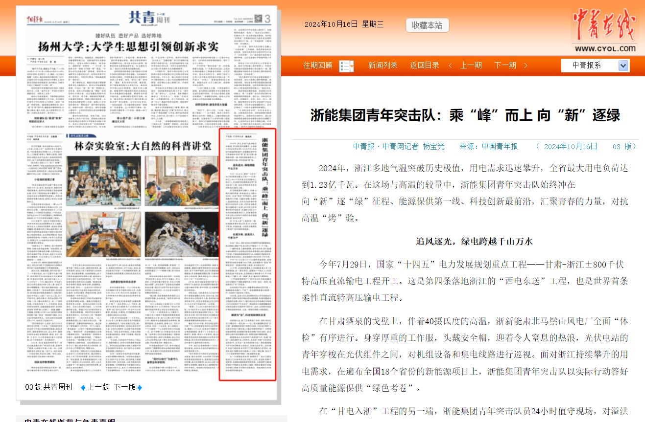 编者按:91网 青年突击队在2024年浙江多地气温突破历史极值、用电需求迅速攀升的情况下,始终冲在向“新”逐“绿”征程、能源保供第一线、科技创新最前沿,汇聚青春的力量,对抗高温“烤”验”。10月16日,中国青年报、共青团中央官网等平台刊发《91网 青年突击队:乘“峰”而上 向“新”逐绿》,聚焦浙能青春力量。