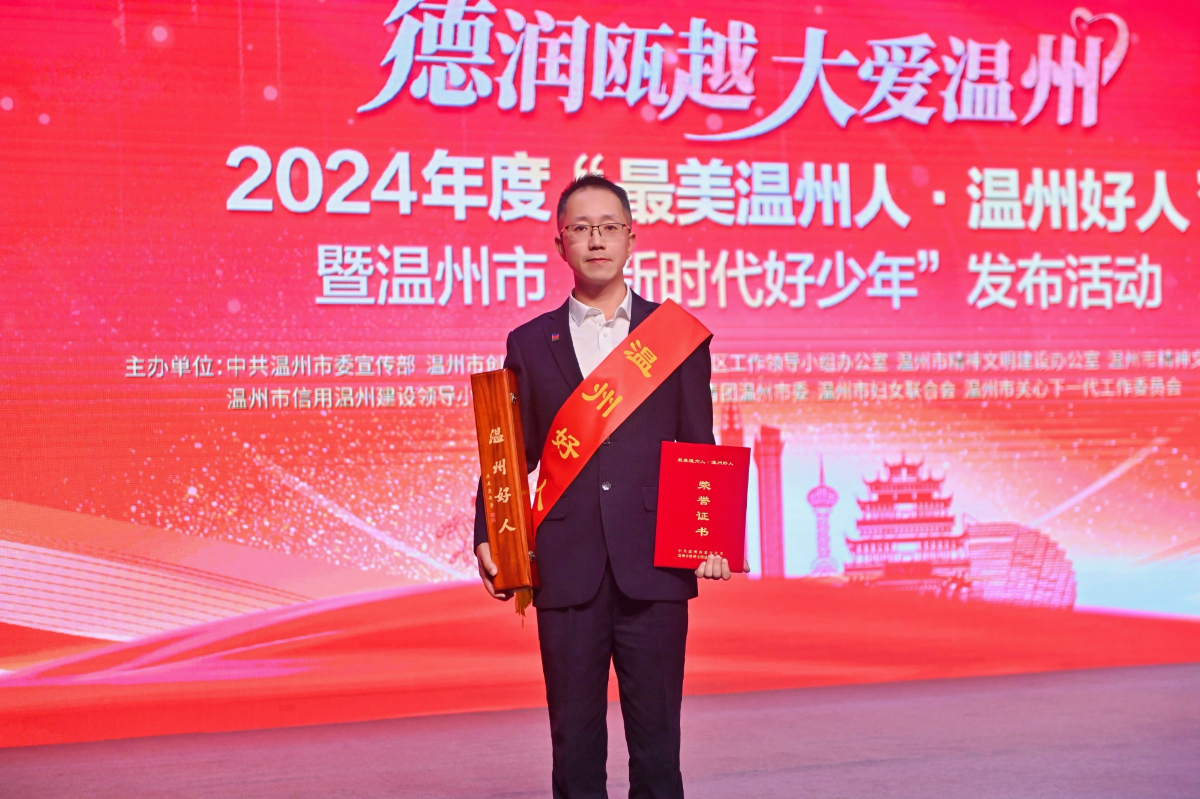 本网讯 近日,从2024年度“最美温州人·温州好人”发布活动现场传来喜讯,浙能旗下综合能源销售公司党员职工何明远同志因见义勇为救助溺水者事迹,被中共温州市委宣传部、温州市精神文明建设办公室授予“最美温州人 温州好人”荣誉称号并颁发证书。