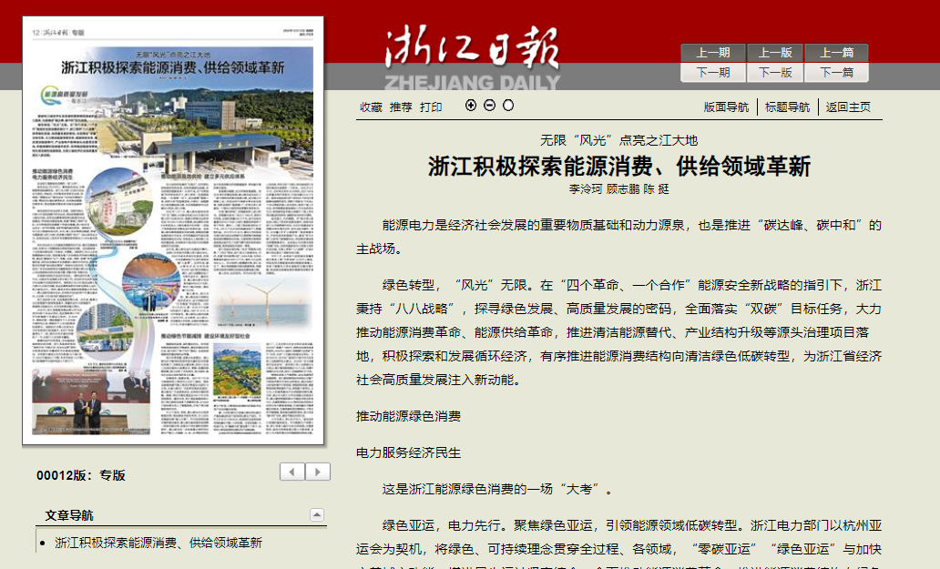 浙江日报12月12日12版《浙江积极探索能源消费、供给领域革新》图。 浙江日报 图