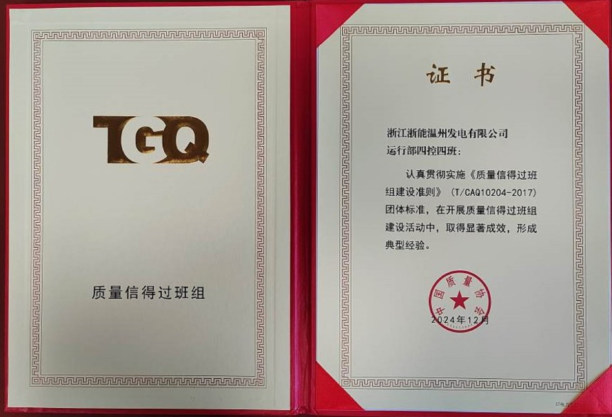 温州发电公司运行部四控四班“全国质量信得过班组”荣誉证书。 王俪颖 摄