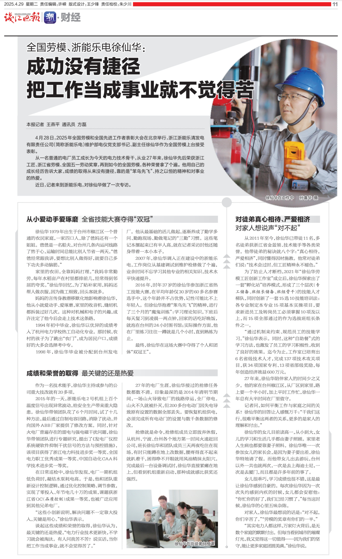 4月29日,钱江晚报报道《全国劳模、浙能乐电徐仙华:成功没有捷径,把工作当成事业就不会觉得苦》。 钱江晚报 提供