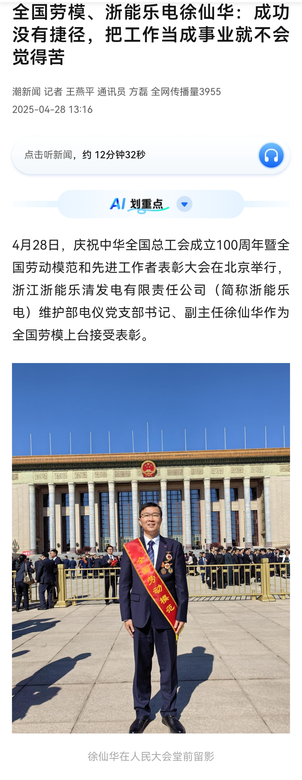 媒体报道 | 全国劳模、浙能乐电徐仙华:成功没有捷径,把工作当成事业就不会觉得苦