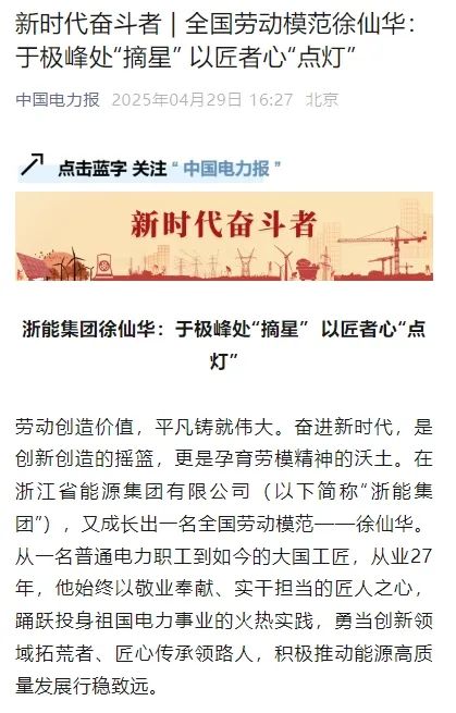 4月29日,中国电力报刊发《全国劳动模范徐仙华:于极峰处“摘星” 以匠者心“点灯”》。 中国电力报 摄