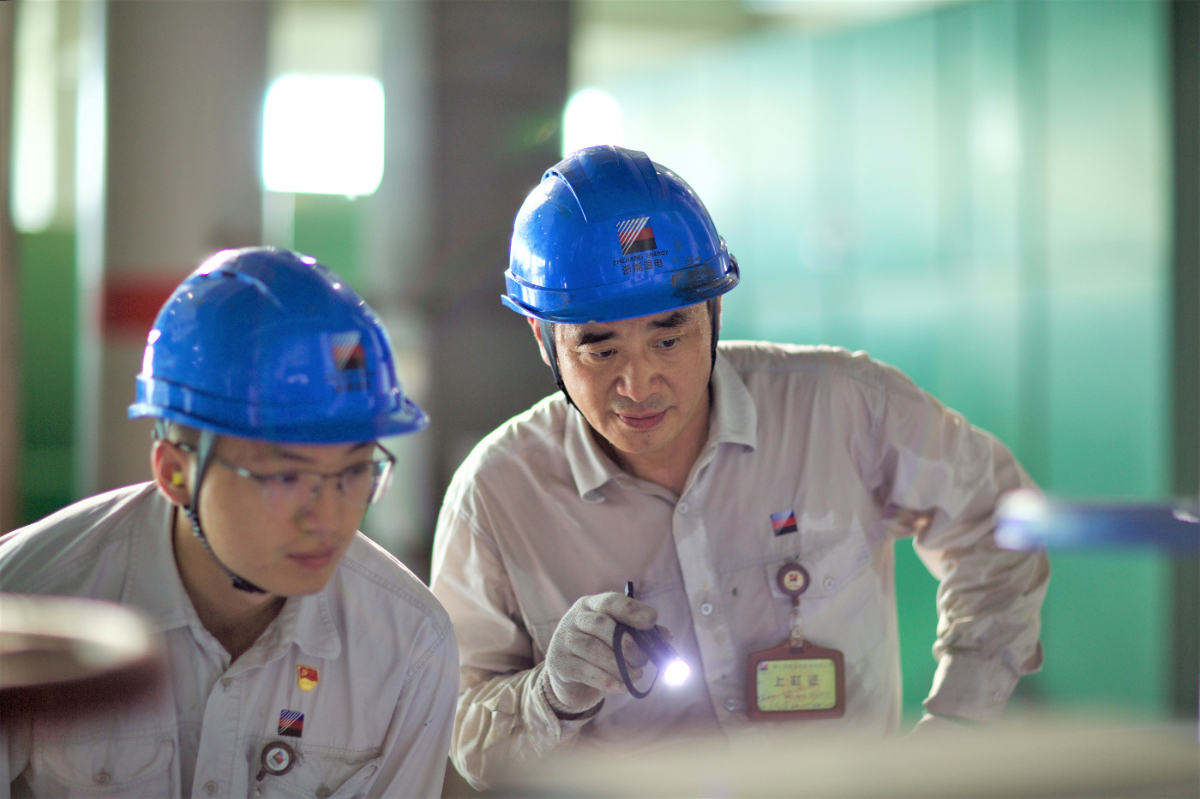 浙能温电维护部汽机一班副班长马晓晖与班组骨干一起进行设备消缺前检查。 葛晓葵 摄