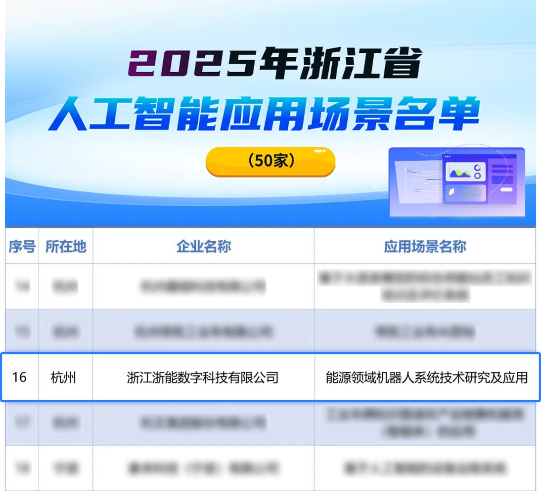 本网讯 近日,2025年浙江省人工智能应用场景名单公布,浙能数科“能源领域机器人系统技术研究及应用”成功入选。