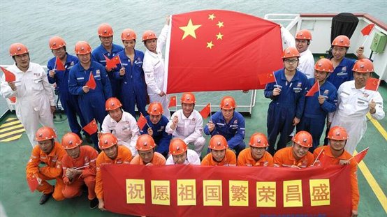 在锚地等候装卸的浙能“明州76”轮全体船员与国旗同框,共庆新中国成立70周年。董建国 摄