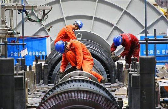 国庆节当日,浙能镇海发电公司运行部工人正在6号机大修现场施工作业。董英姿 摄