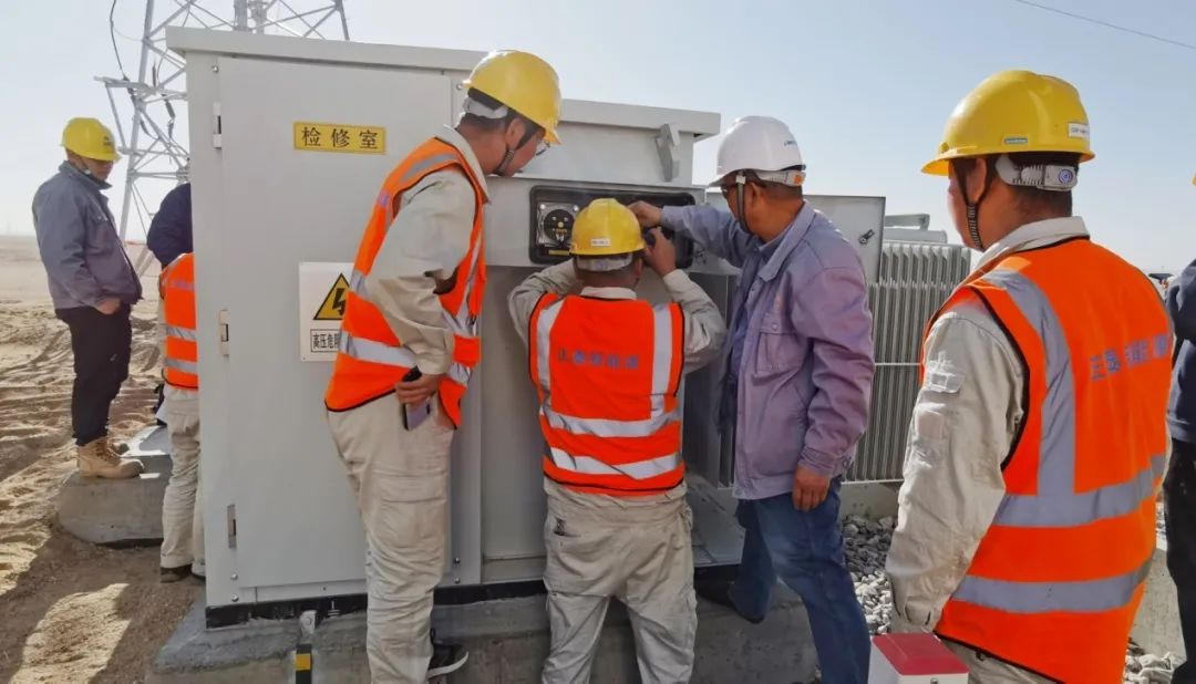 职工们进行并网前箱式变压器检查