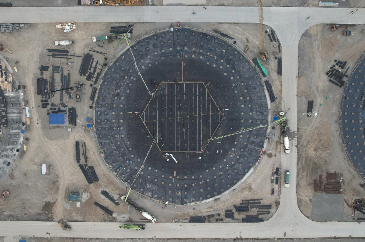 据了解,浙能六横LNG接收站储罐承台直径为96.8米,厚度在1.2米至1.5米之间,将承载约18万吨的巨大压力,起到“承上启下”的重要作用。“储罐承台基础混凝土浇筑是储罐建设过程中十分关键的一环,本项目四座储罐承台大体积混凝土浇筑总方量约3.88万立方米,预计3月底前完成浇筑。”该储罐建安工程党员突击队周队长说。