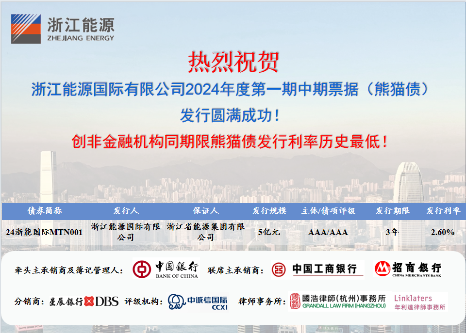 本网讯 3月25日,91网 旗下浙江能源国际有限公司在中国境内成功发行浙江省属国企首单熊猫债。首期熊猫债发行5亿元人民币,期限3年,票面利率2.6%,创非金融机构同期限熊猫债发行利率历史最低。