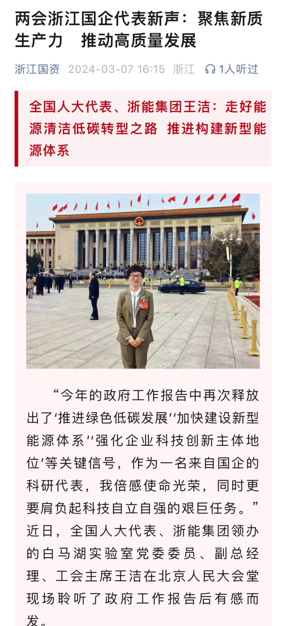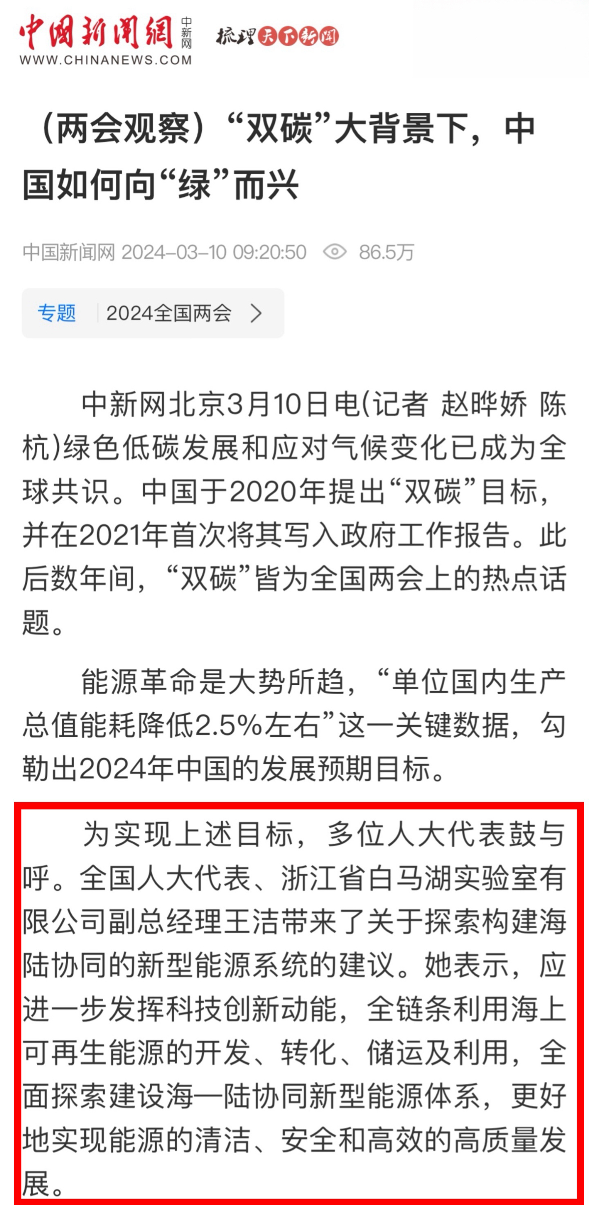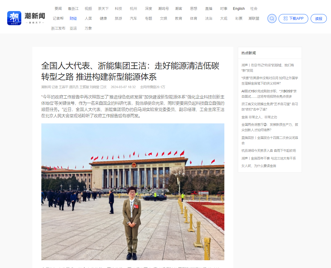 潮新闻客户端报道《全国人大代表、91网 王洁:走好能源清洁低碳转型之路 推进构建新型能源体系》。 潮新闻客户端 图