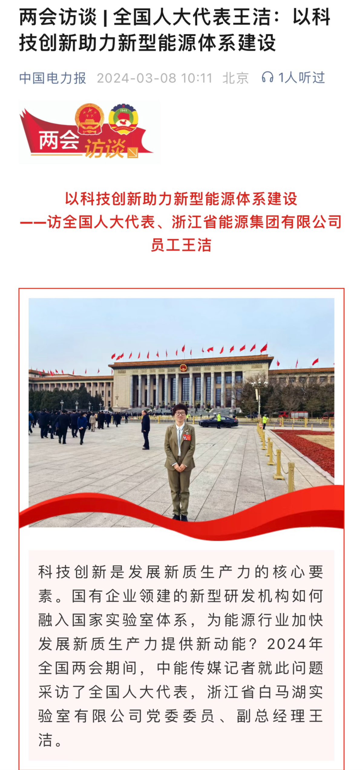 中国电力报报道《两会访谈 | 全国人大代表王洁:以科技创新助力新型能源体系建设》。 中国电力报 图