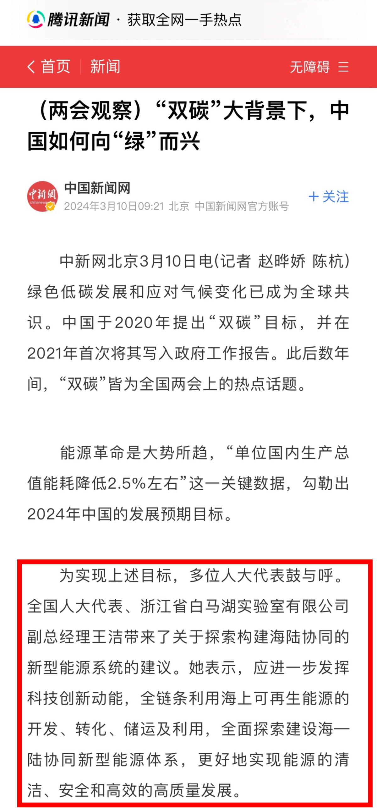 腾讯网报道《(两会观察)“双碳”大背景下,中国如何向“绿”而兴》 腾讯网 图