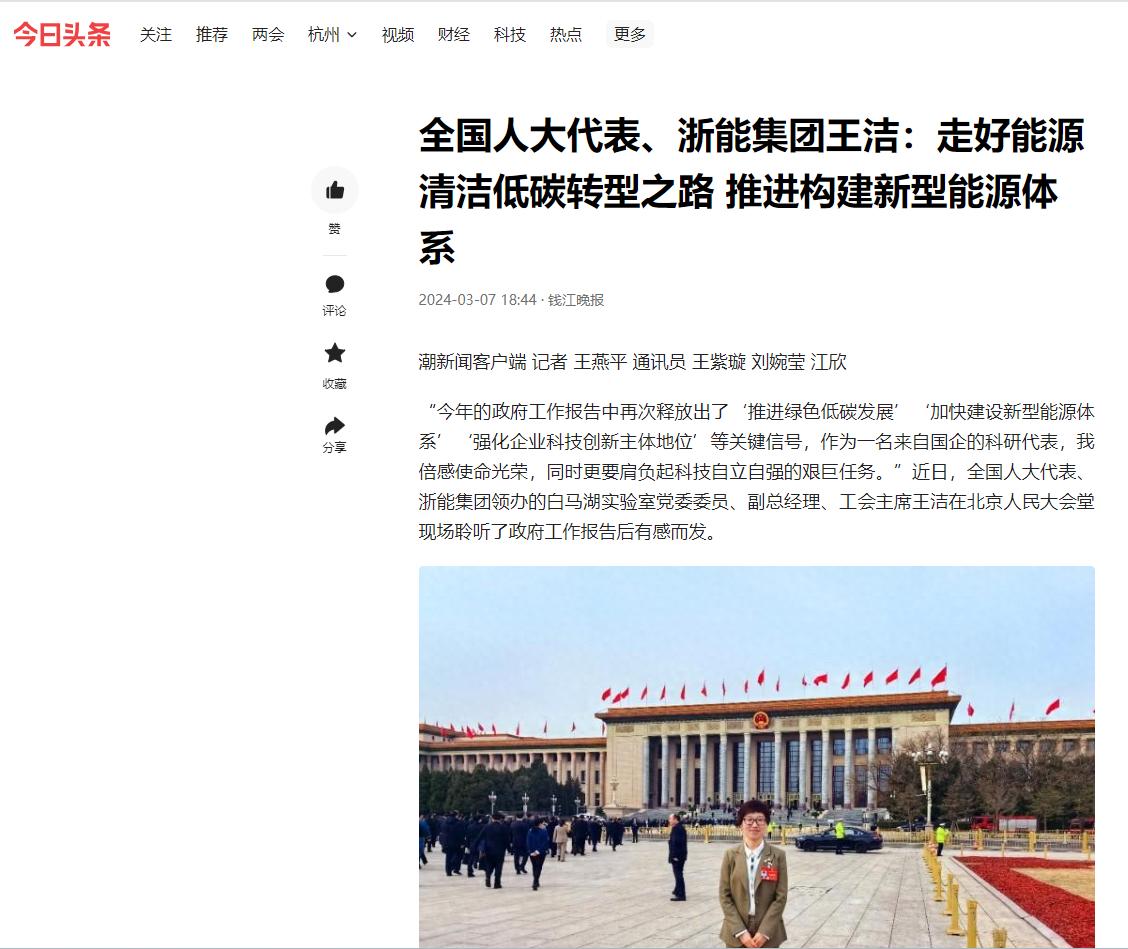 人民日报、中新社中新网、中国能源网、中国电力报、浙江卫视《浙江新闻联播》、潮新闻客户端、浙江国资公众号、今日头条、腾讯新闻等多家媒体聚焦王洁代表献言履职。