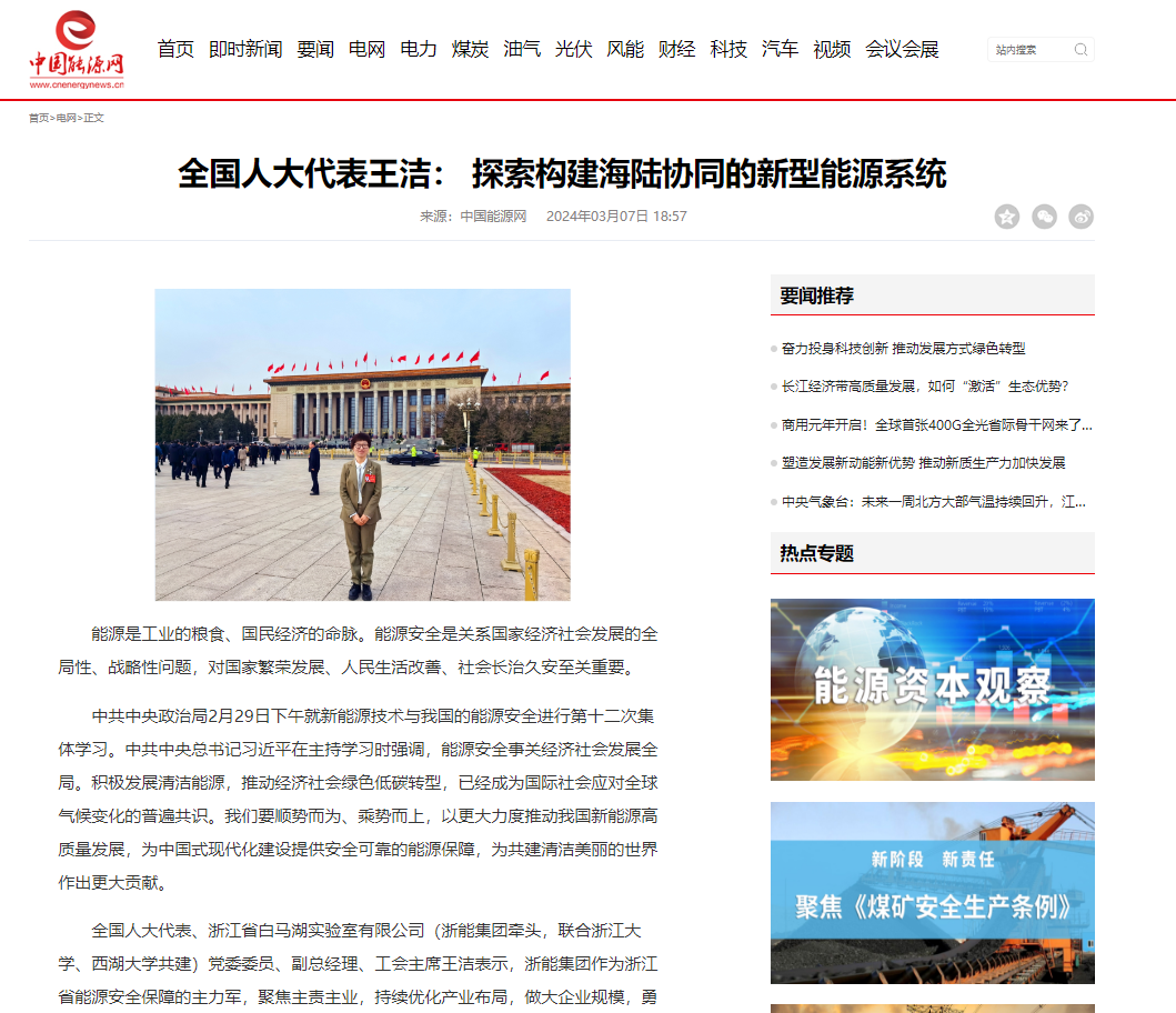 中国能源网报道《全国人大代表王洁: 探索构建海陆协同的新型能源系统》。 中国能源网 图