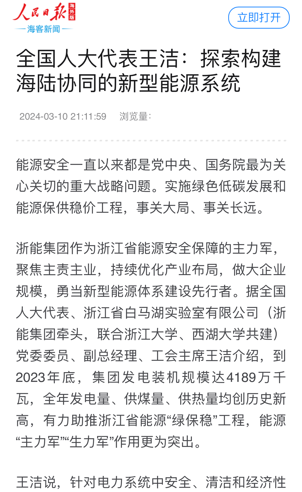人民日报海外版官网报道《全国人大代表王洁:探索构建海陆协同的新型能源系统》。 人民日报海外版官网 图
