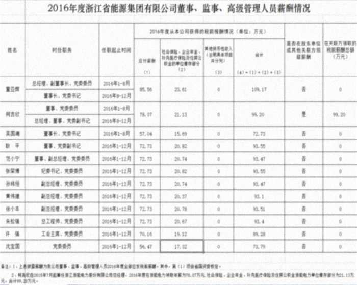 2016年度浙江省能源集团有限公司董事、监事、高级管理人员薪酬情况